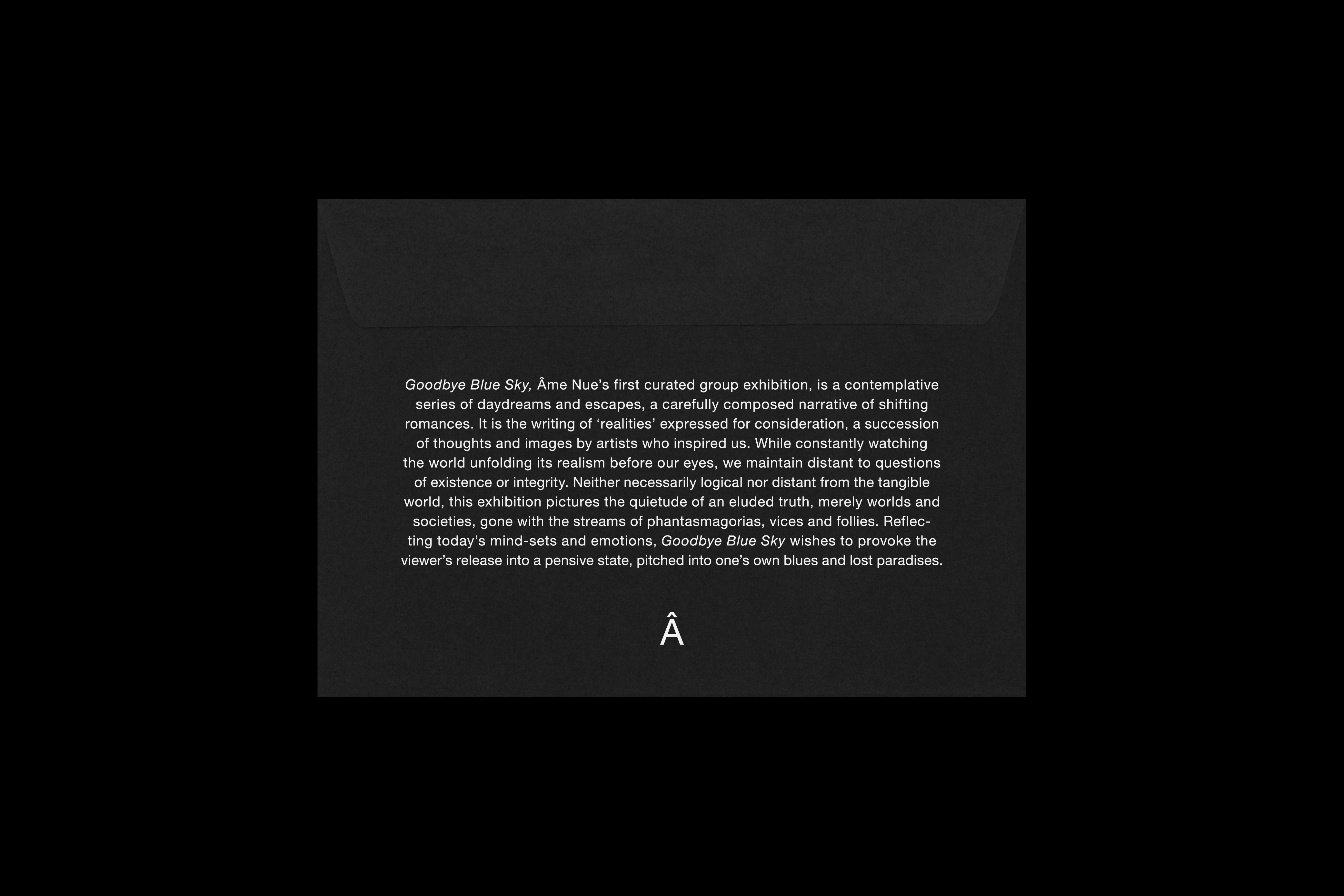 Goodbye Blue Sky, Âme Nue’s first curated group exhibition (25.5.–3.6.18), is a contemplative series of daydreams and escapes, a carefully composed narrative of shifting romances. It is the writing of ‘realities’ expressed for consideration, a succession of thoughts and images by artists who inspired us. While constantly watching the world unfolding its realism before our eyes, we maintain distant to questions of existence or integrity. Neither necessarily logical nor distant from the tangible world, this exhibition pictures the quietude of an eluded truth, merely worlds and societies, gone with the streams of phantasmagorias, vices and follies. Reflecting today’s mind-sets and emotions, Goodbye Blue Sky wishes to provoke the viewer’s release into a pensive state, pitched into one’s own blues and lost paradises.