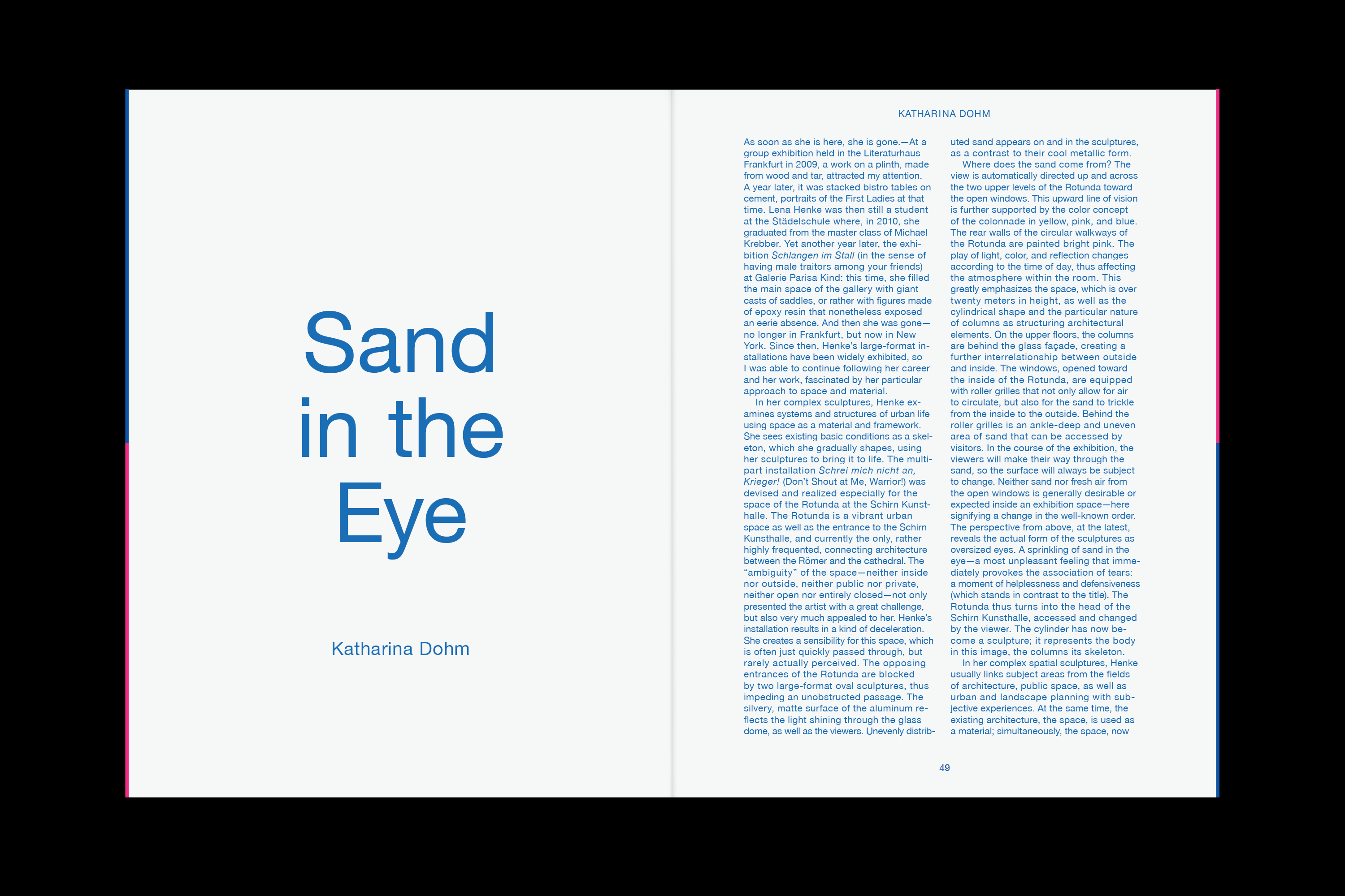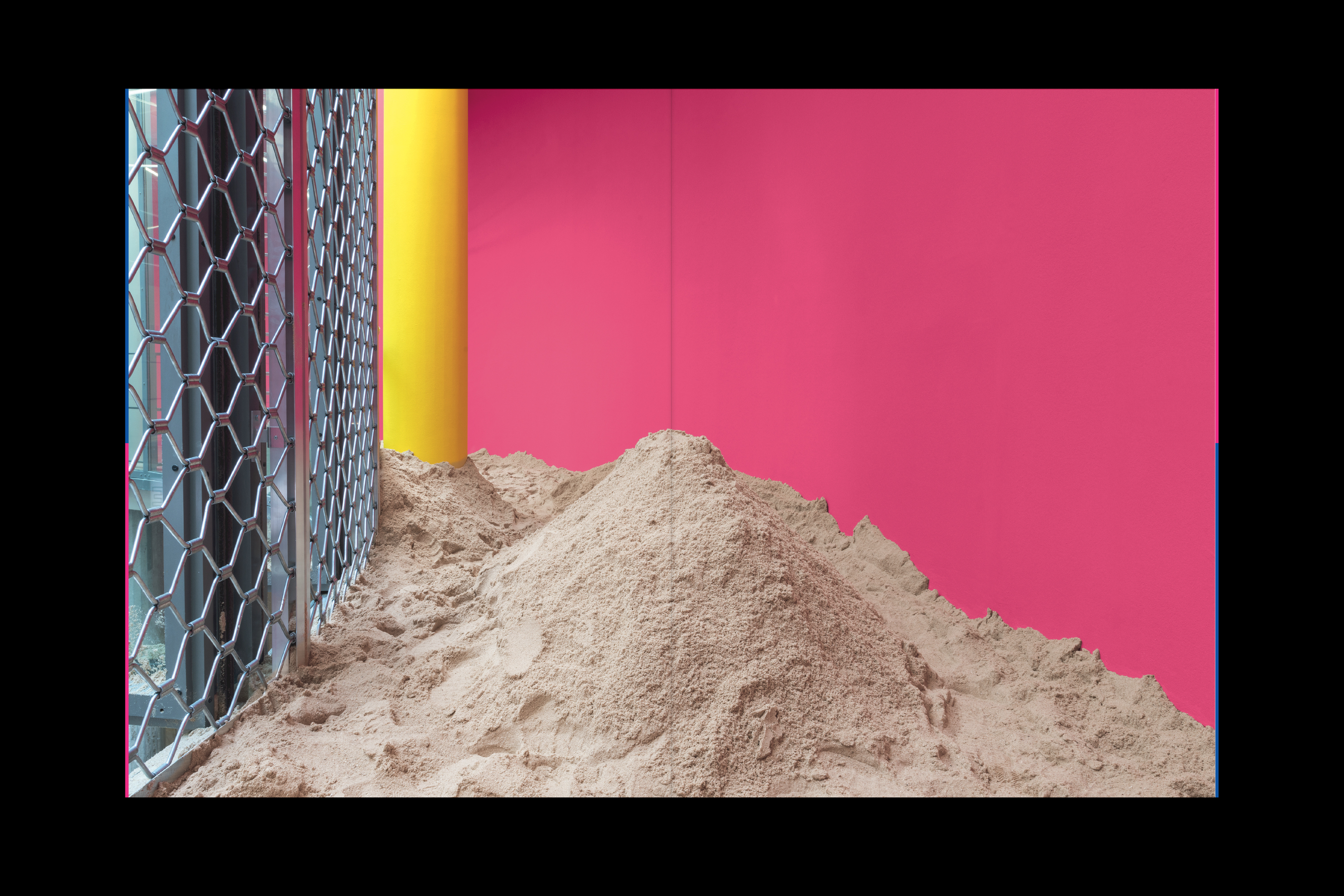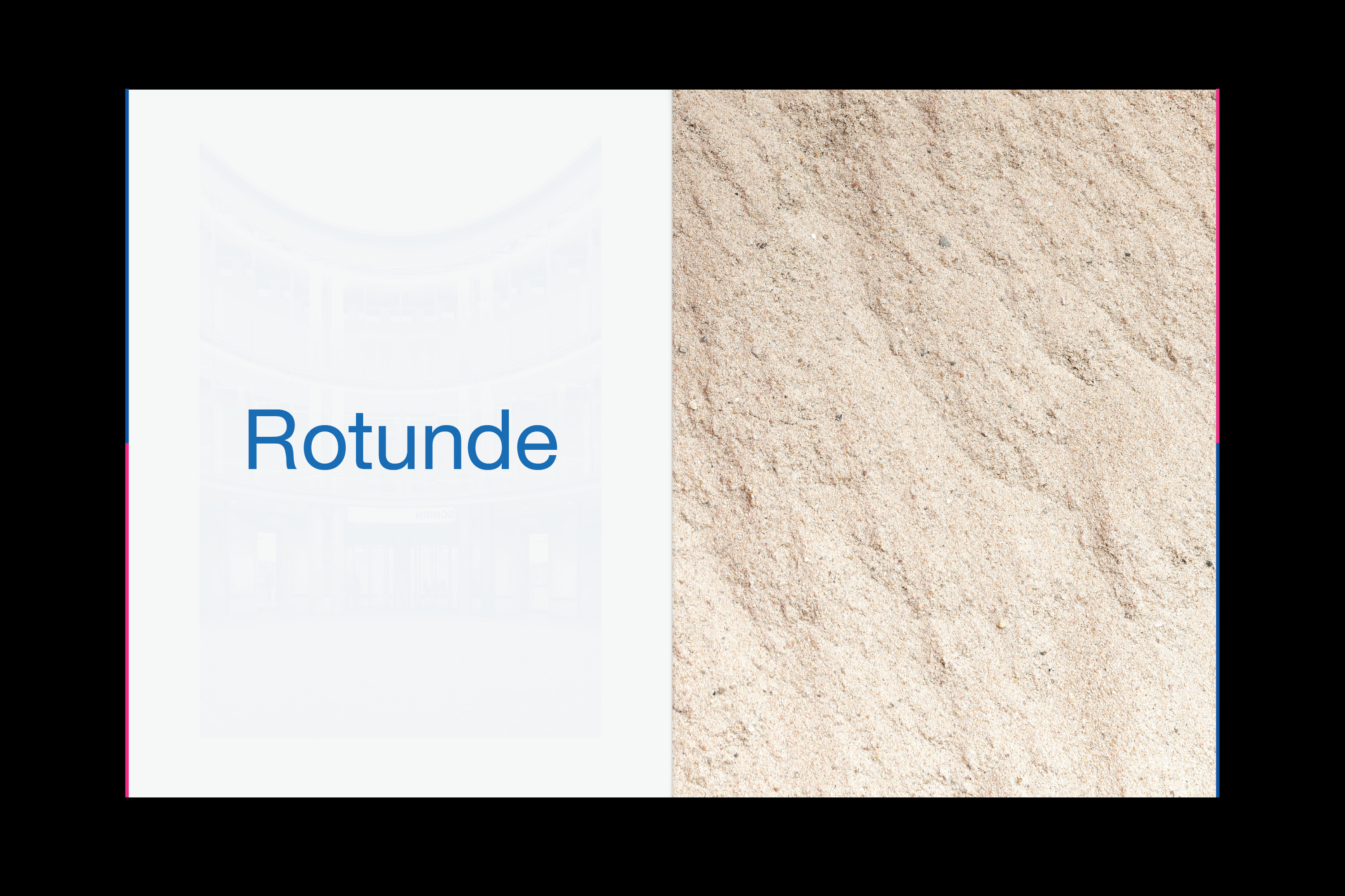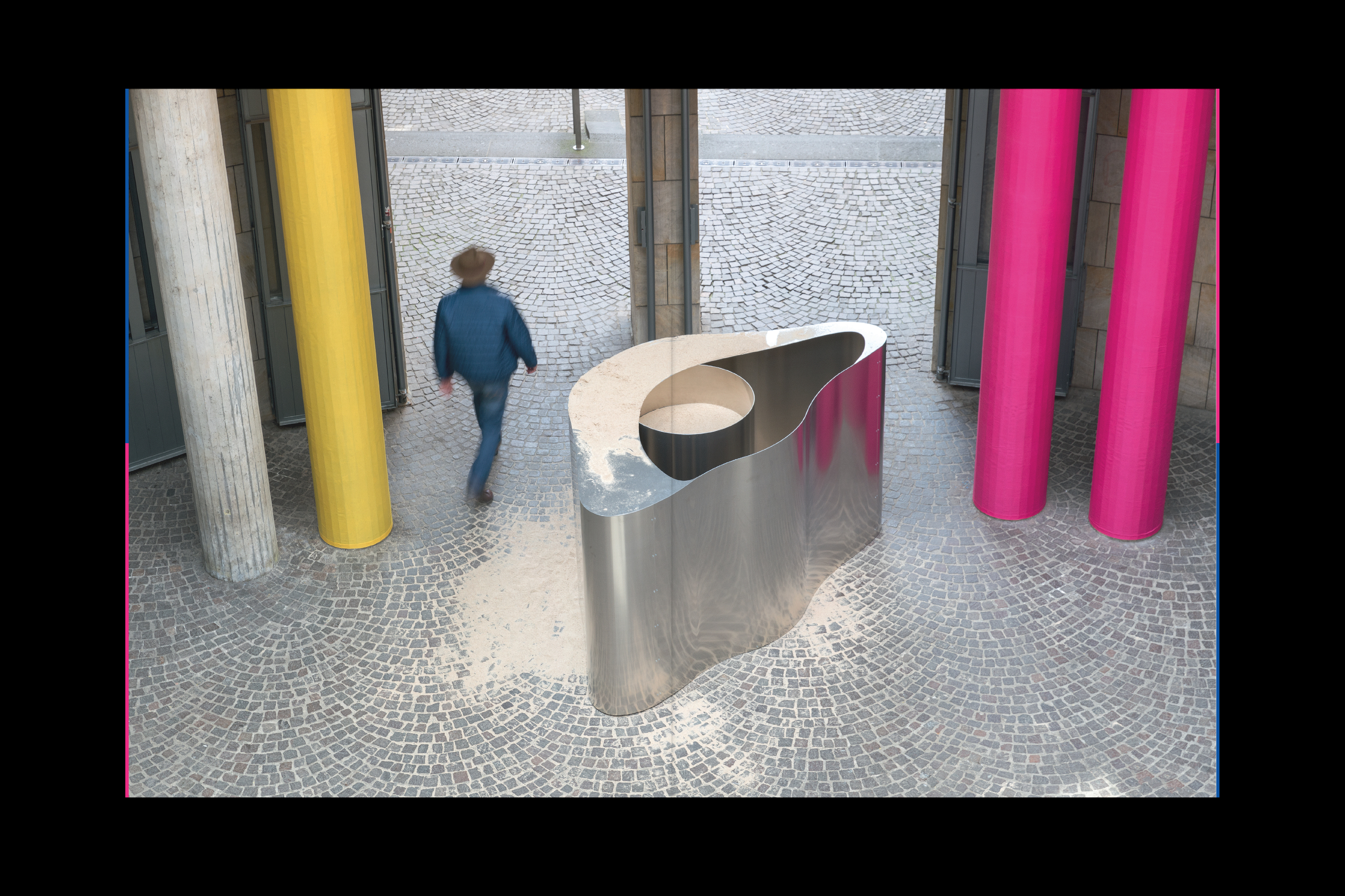 From April 28 to July 30, 2017, the Schirn Kunsthalle Frankfurt is presenting a spatial sculpture by the artist Lena Henke. In the work specially created for the Schirn Rotunda entitled Schrei mich nicht an, Krieger! (Don’t Shout at Me, Warrior!), the sculptor reacts to the specific conditions of this freely accessible public space. Henke sees the Rotunda as a space in which interior and exterior merge in a very distinct way—as the entrance to the Schirn, as an exhibition space, and as an element of urban architecture between the Cathedral and the Römer. In her installation Henke concentrates on this ambivalent capacity of the space, thereby creating an awareness of the unique character of the location. In the two opposing entrances to the Rotunda, the artist positions two aluminium sculptures that are open at the top and filled with sand. It is not clear at first how this sand came to be in and on top of the objects. Henke guides the viewer’s gaze through a system of colors, which accentuates the architecture upwards to the open windows of the circular galleries surrounding the Rotunda. There sand is also placed and trickles outwards and into the sculptures through coarse-meshed metal rolling grills. The visitors can stroll round the galleries and walk through the sand, hence influencing the circulation as well. At the same time, from up there the form of the objects in the Rotunda becomes visible: they are two oversized eyes. The association of sand in the eye—an unpleasant feeling involving discomfort and pain—suggests itself. In her works, the artist combines topics such as architecture, public space, and urban planning with subjective experiences. Her starting material is the site as she encounters it; she heightens it and stages it in a perceivable way. Thus Henke transforms the Schirn Rotunda into a walkable and constantly changing spatial sculpture in which inside and outside merge. In her formal language and her use of materials she makes deliberate references, in particular to modern and recent art history, bringing together Surrealism and Minimal Art. By consciously investigating traditional artistic strategies and aesthetic concepts, Henke creates new visual experiences and contexts of meaning. The change of perspective is an important element in her works and essential for the insight into things and into life itself. Her works can be read as a self-confident statement of contemporary art, which is given additional expression in the powerful title of her work for the Schirn.