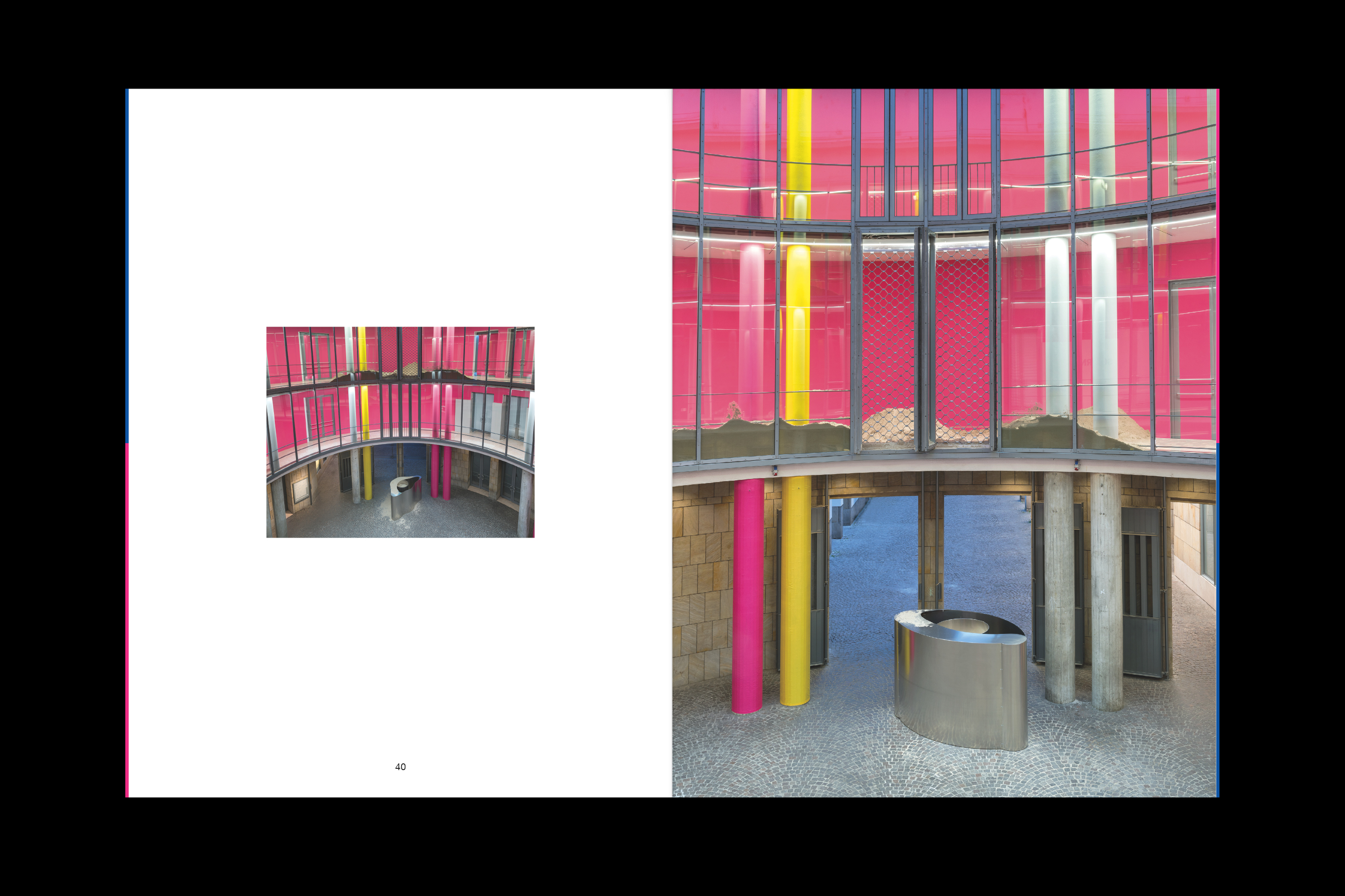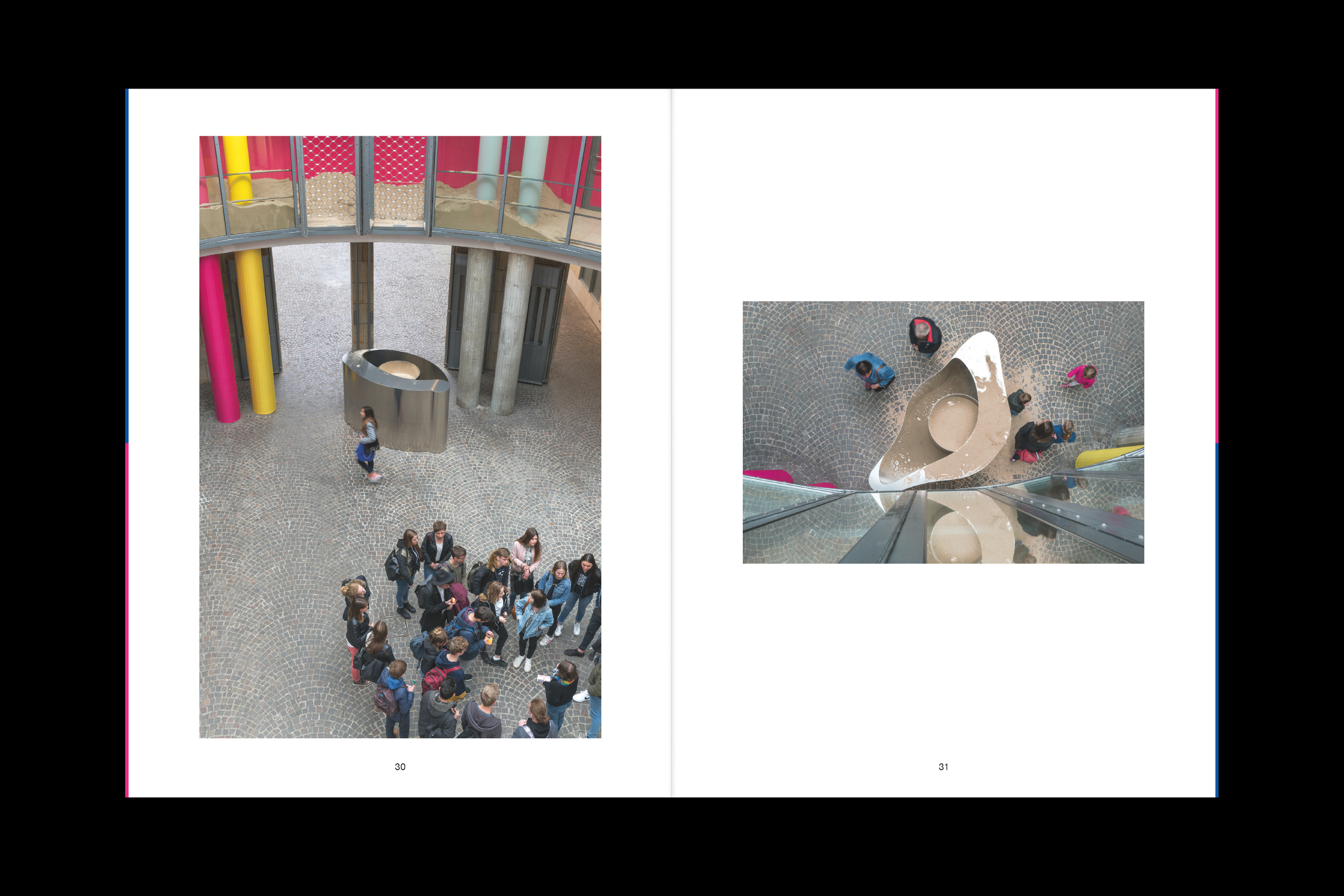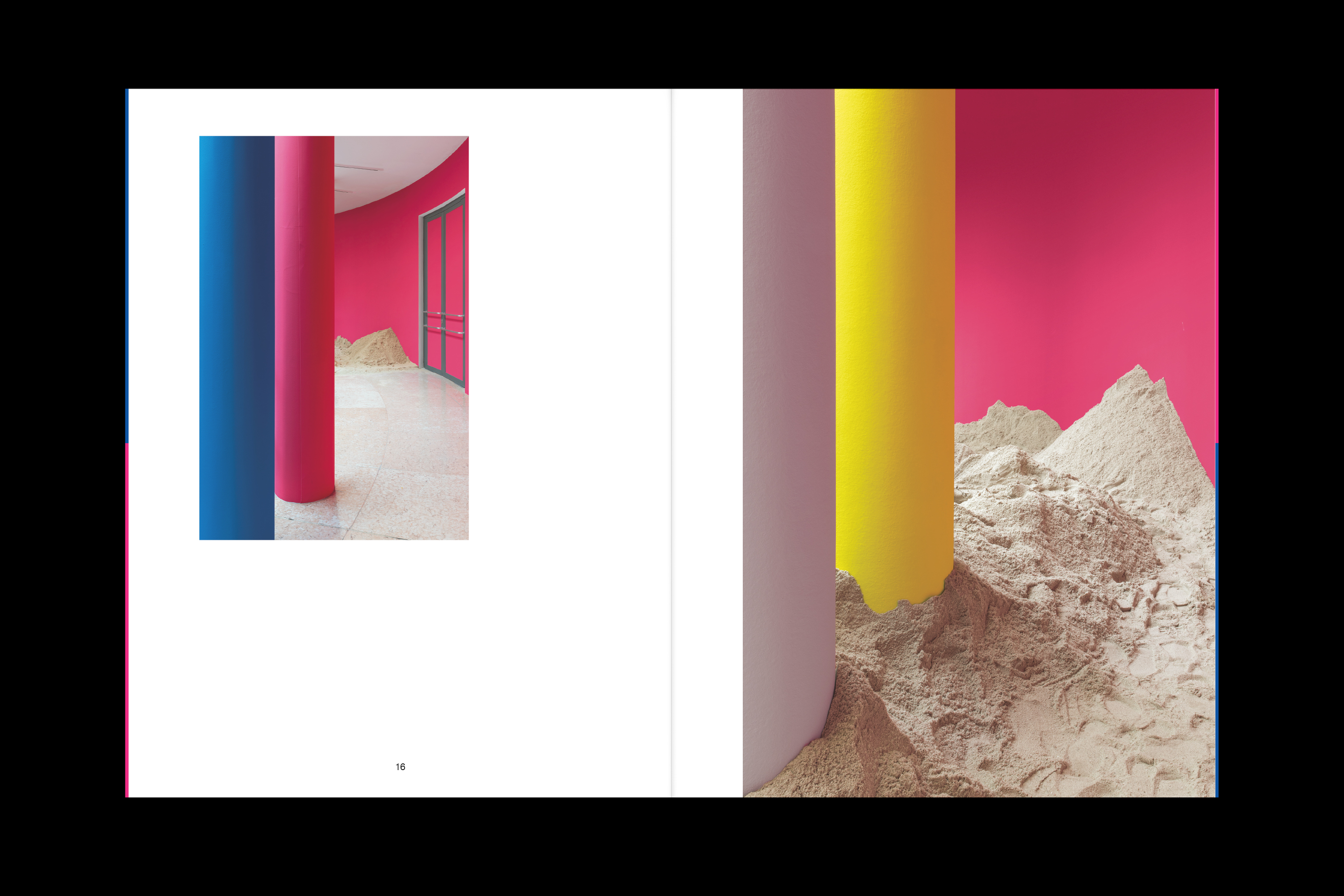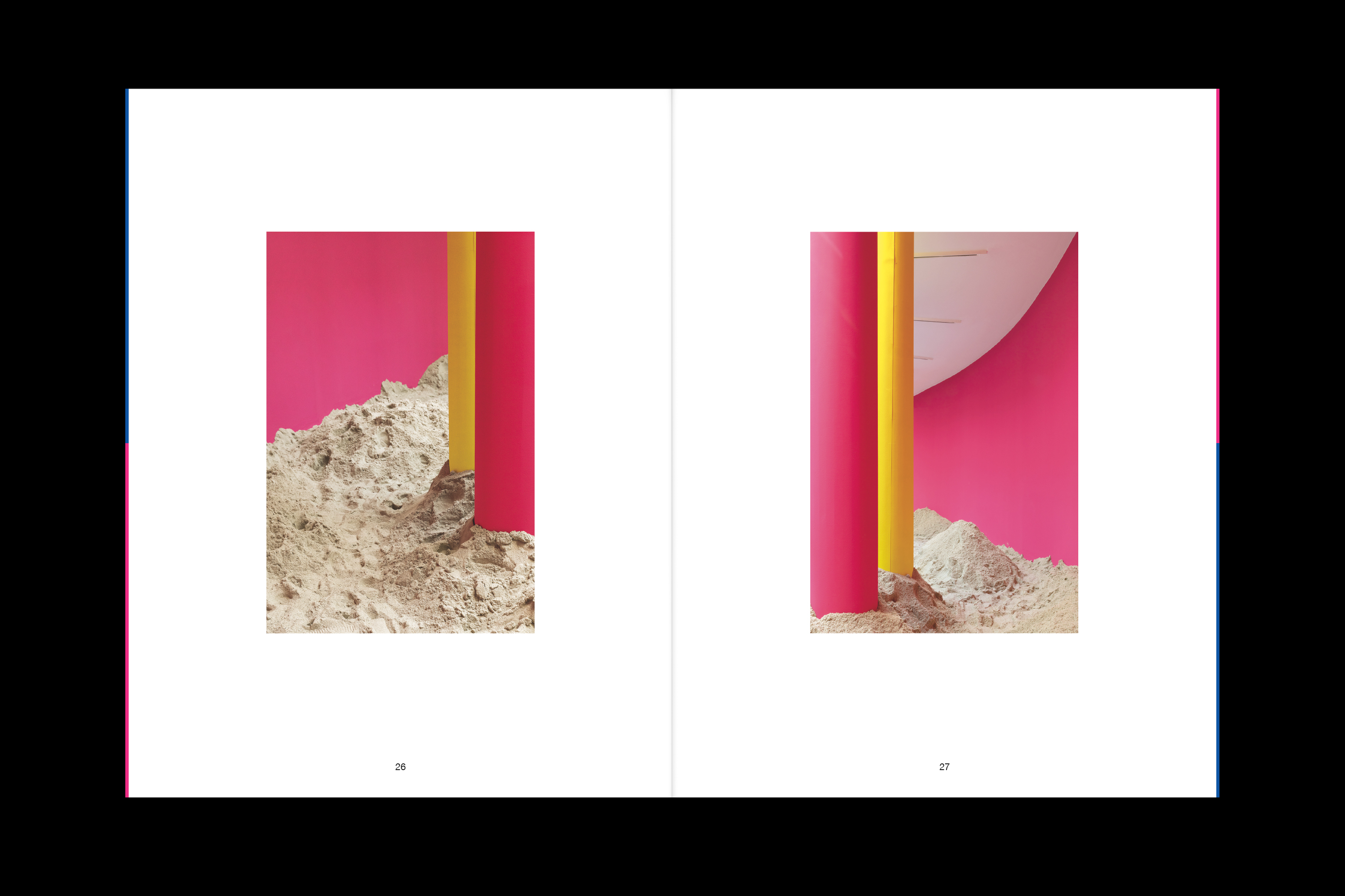 From April 28 to July 30, 2017, the Schirn Kunsthalle Frankfurt is presenting a spatial sculpture by the artist Lena Henke. In the work specially created for the Schirn Rotunda entitled Schrei mich nicht an, Krieger! (Don’t Shout at Me, Warrior!), the sculptor reacts to the specific conditions of this freely accessible public space. Henke sees the Rotunda as a space in which interior and exterior merge in a very distinct way—as the entrance to the Schirn, as an exhibition space, and as an element of urban architecture between the Cathedral and the Römer. In her installation Henke concentrates on this ambivalent capacity of the space, thereby creating an awareness of the unique character of the location. In the two opposing entrances to the Rotunda, the artist positions two aluminium sculptures that are open at the top and filled with sand. It is not clear at first how this sand came to be in and on top of the objects. Henke guides the viewer’s gaze through a system of colors, which accentuates the architecture upwards to the open windows of the circular galleries surrounding the Rotunda. There sand is also placed and trickles outwards and into the sculptures through coarse-meshed metal rolling grills. The visitors can stroll round the galleries and walk through the sand, hence influencing the circulation as well. At the same time, from up there the form of the objects in the Rotunda becomes visible: they are two oversized eyes. The association of sand in the eye—an unpleasant feeling involving discomfort and pain—suggests itself. In her works, the artist combines topics such as architecture, public space, and urban planning with subjective experiences. Her starting material is the site as she encounters it; she heightens it and stages it in a perceivable way. Thus Henke transforms the Schirn Rotunda into a walkable and constantly changing spatial sculpture in which inside and outside merge. In her formal language and her use of materials she makes deliberate references, in particular to modern and recent art history, bringing together Surrealism and Minimal Art. By consciously investigating traditional artistic strategies and aesthetic concepts, Henke creates new visual experiences and contexts of meaning. The change of perspective is an important element in her works and essential for the insight into things and into life itself. Her works can be read as a self-confident statement of contemporary art, which is given additional expression in the powerful title of her work for the Schirn.
