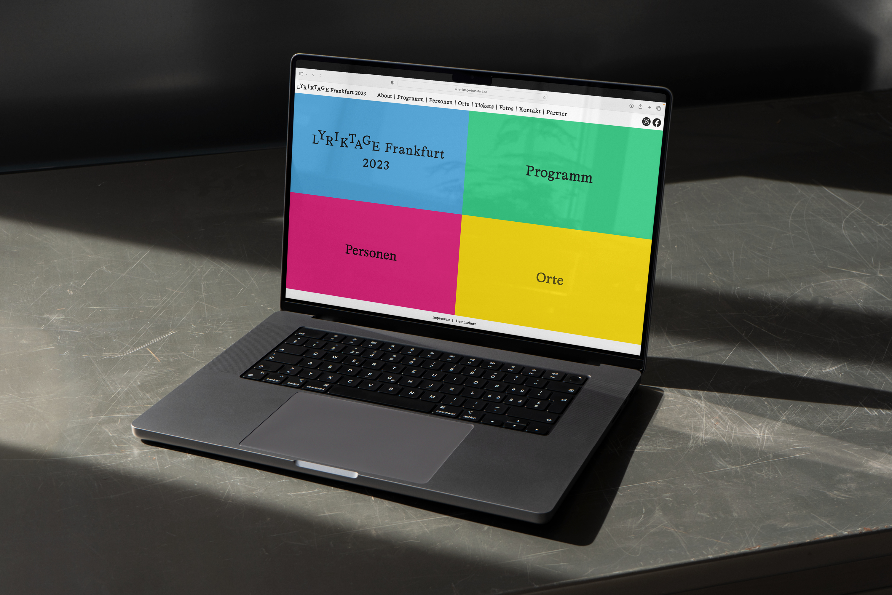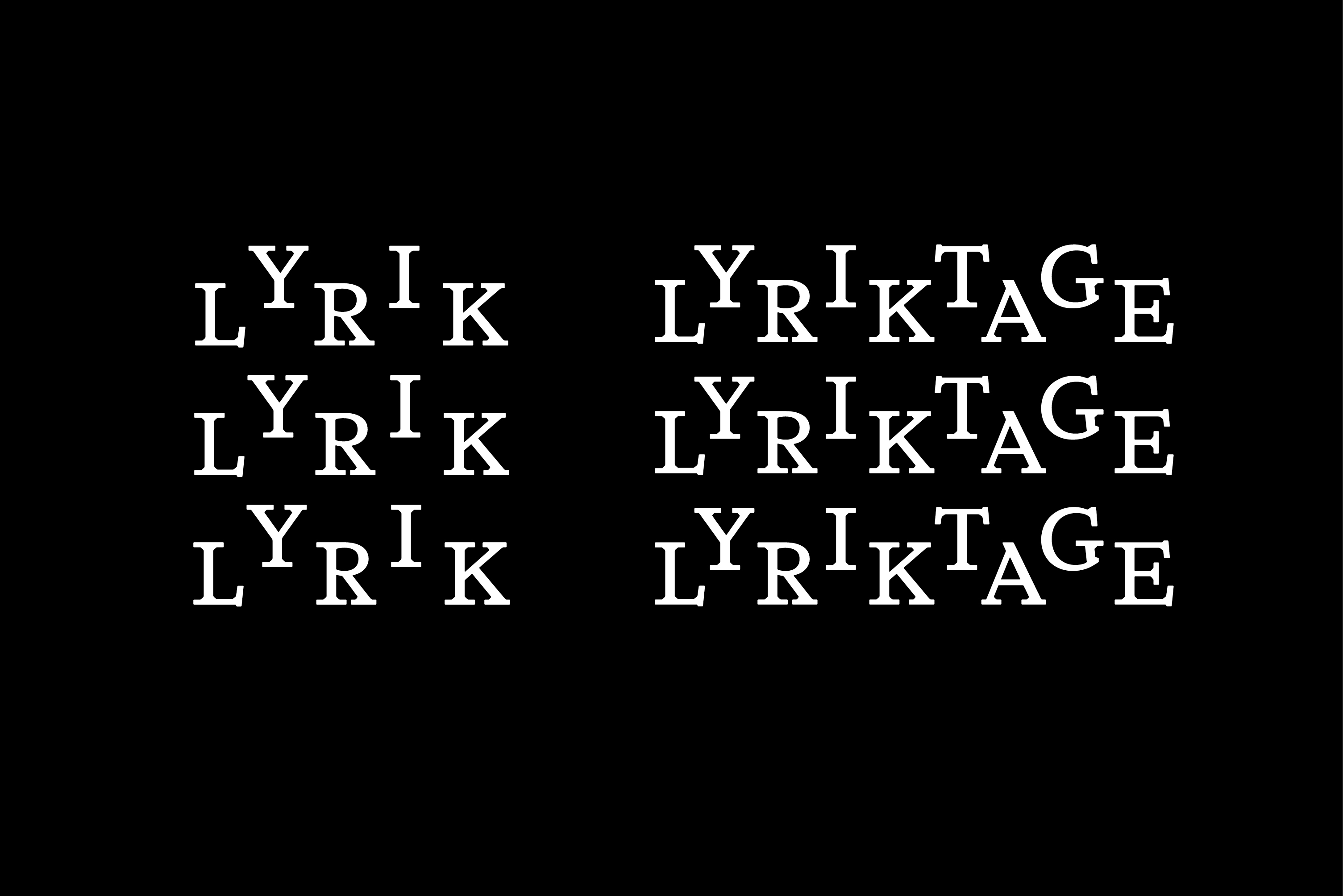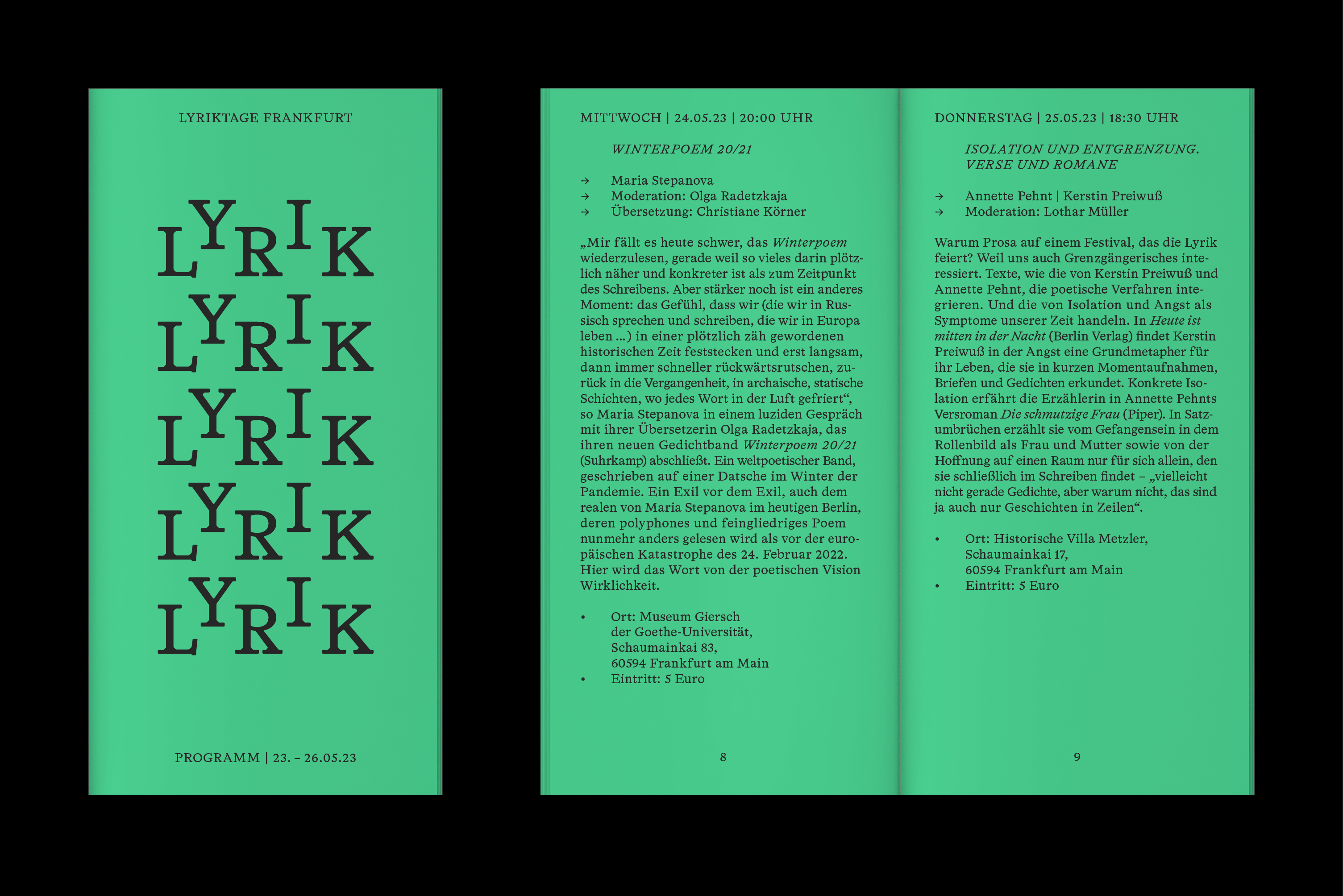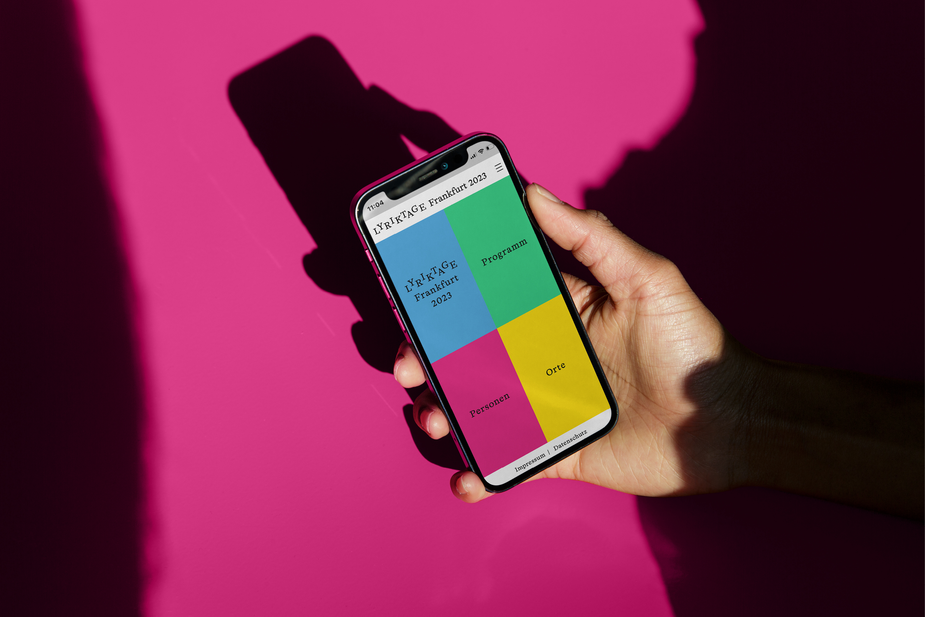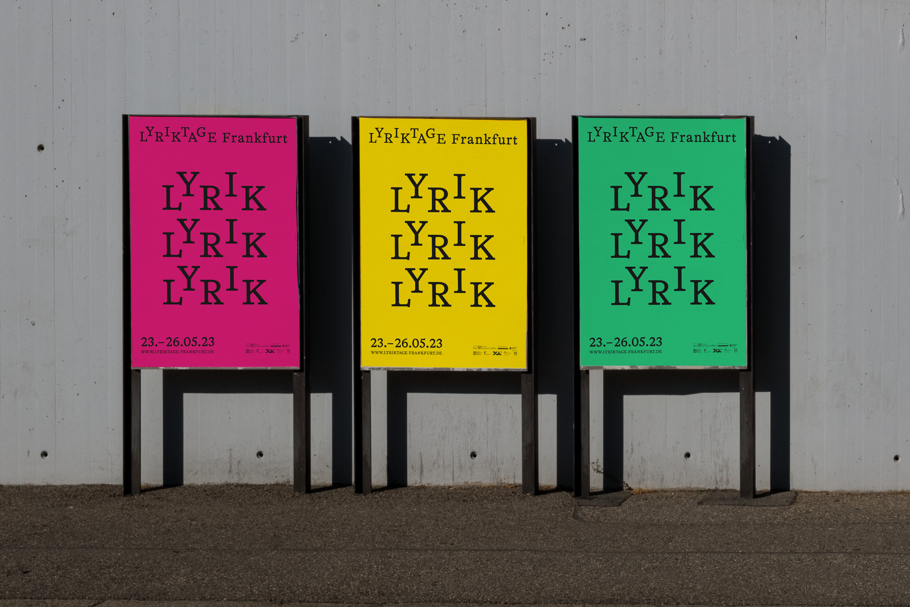 A design concept was developed for the Frankfurt Lyric Days 2023 that captures the “liveliness of poetry”. The logo features jumping letters to convey this dynamism. The HAL Timezone font was chosen to create a mix of a classic and modern look. The colour concept pays homage to classic softcover literature books. The colours chosen are intended to create an atmosphere of freshness and vibrancy while combining seriousness and playfulness. The poster will be printed in three selected colours that will serve as key elements for all festival media.