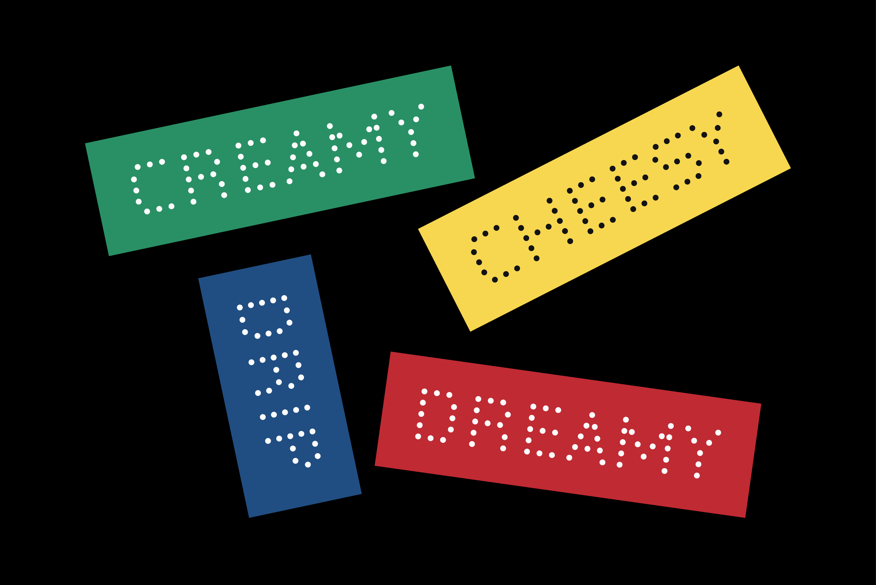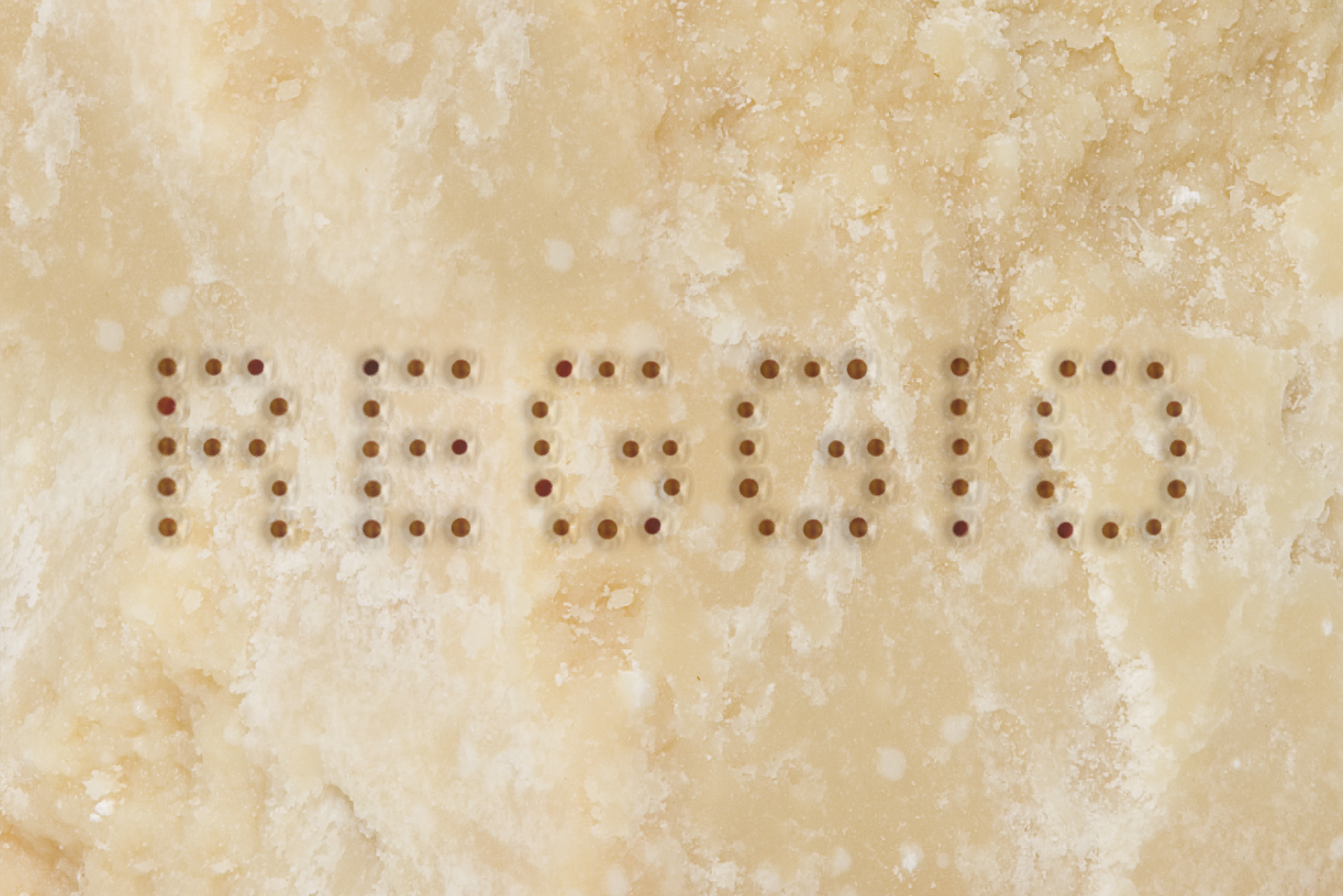 REGGIO is a typeface designed by Michael Satter and inspired by the embossed holes found on the rind of Parmesan cheese. It is specifically used for applications that require punching, embossing or milling. The font was first used in the "Creamy, Dreamy, Cheesy, Drip Magnets" project in collaboration with PUBLIC POSSESSION and CLUB DEL FORMAGGIO Milan. Secondly, REGGIO was used for personalised key rings.