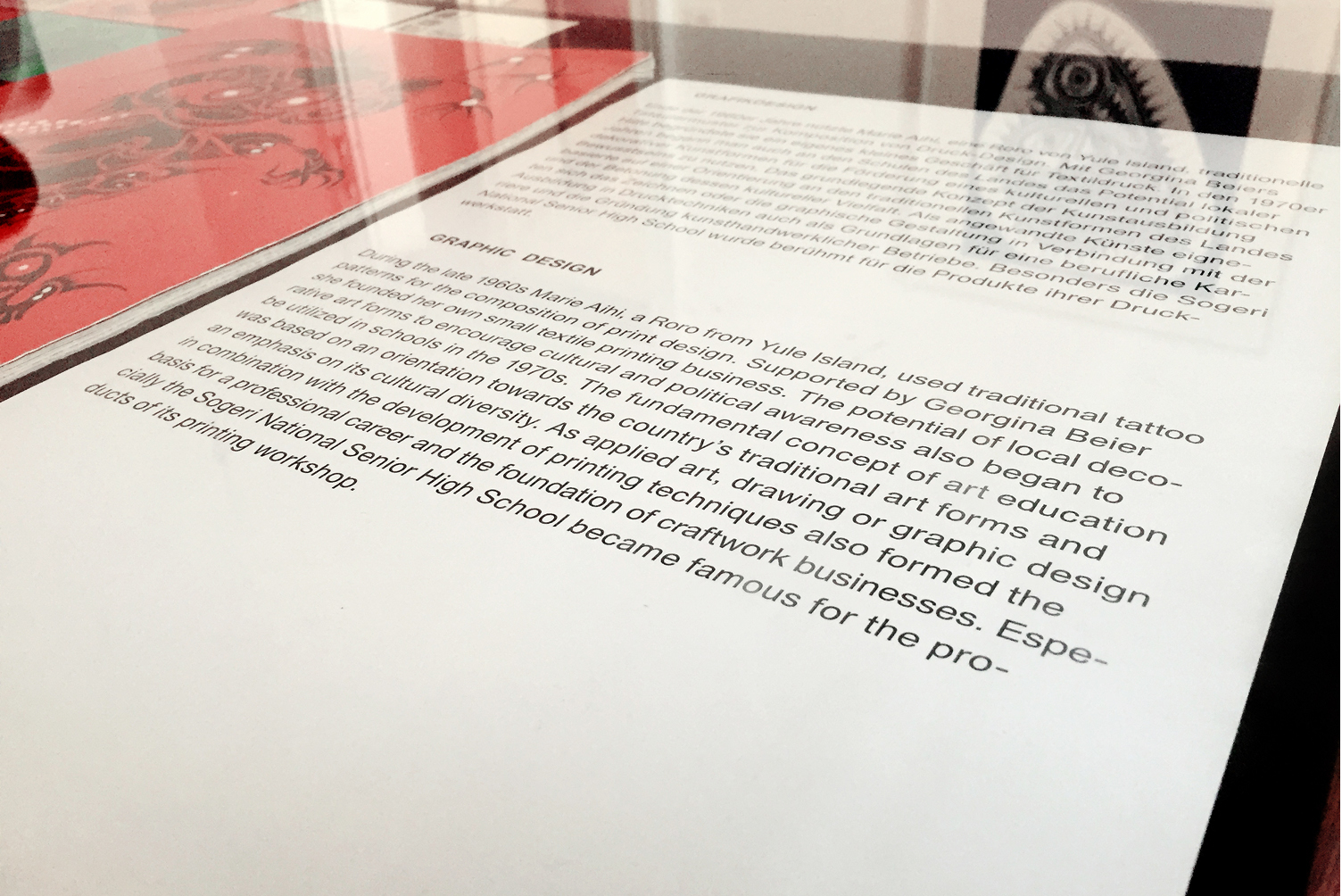 In the Green Room early prints are reminders of the emergence of the so called “outsider art” in the capital Port Moresby. They highlight an art style developed from traditional ornamentation which – also widely used in national book production – even today is generally regarded as a “typical” Papua New Guinea design.